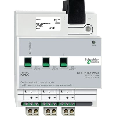 Styrespændingsområdet kan nemt indstilles via ETS-parameter. Enheden giver også mulighed for manuel kobling af tilsluttede belastninger via det manuelle relæ, selv uden bus-spænding. Styreenheden er udstyret med en buskobler, og bustilslutningen er udført med en standard buskonnektor i sort/rød.