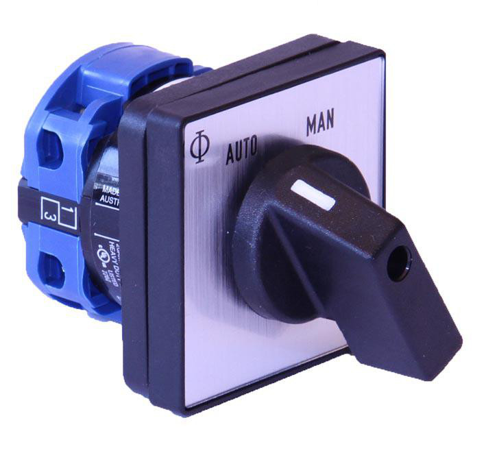 1 polet AUTO-MAN omskifter 20A, til frontmontage med 4 skruer.