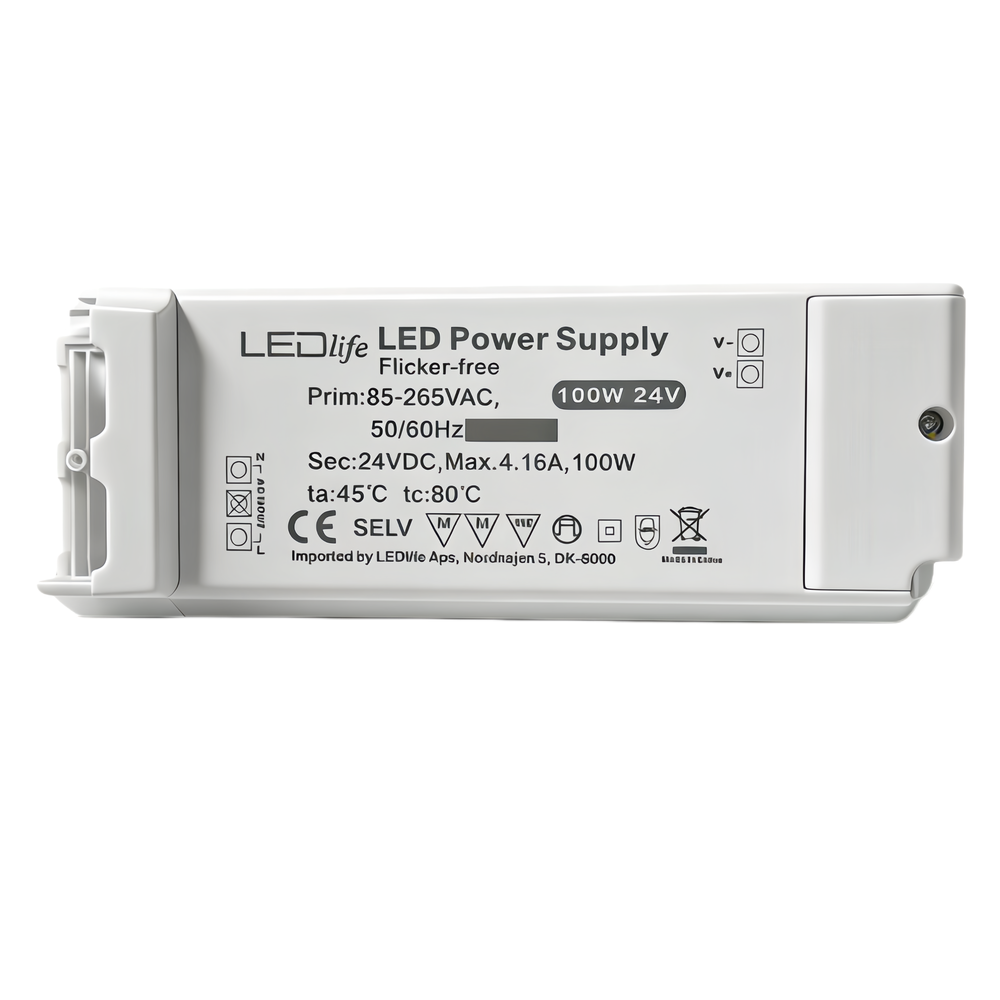 100W / 24V DC strømforsyning - 4,16A, IP20 indendørs, Flicker free