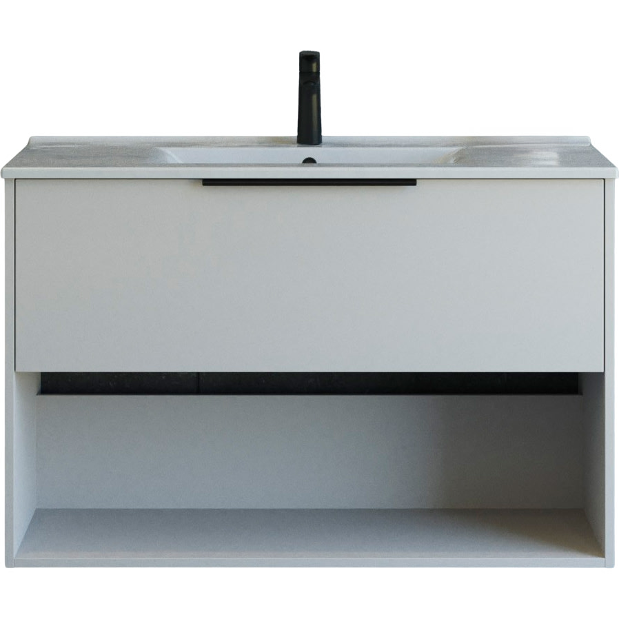 Rummelig 101 cm bred Dansani Mido+ Classic møbelpakke med glat sand mat front, skuffe, hylde og Amber vask i porcelæn. Perfekt til dig, der ønsker opbevaring og æstetik.
