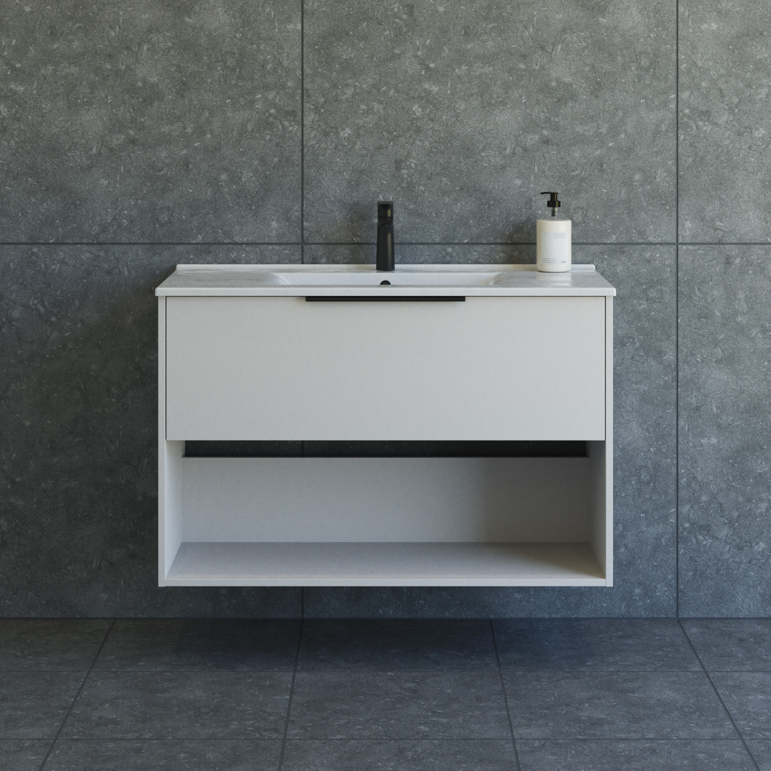 Møbelpakken er udstyret med en skuffe og en åben hylde, som giver dig rig mulighed for at opbevare dine ting. Skuffen er perfekt til opbevaring af mindre genstande, mens hylden er ideel til håndklæder eller andre større ting.