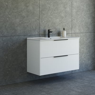 Elegant 101 cm møbelpakke fra Dansani Mido+ Classic med stribet front i hvid mat. To skuffer med soft close giver god opbevaring.