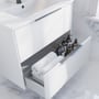 Møbelpakken indeholder to rummelige skuffer med soft close-funktion, der sikrer en lydløs og blid lukning. Skufferne giver rigelig plads til opbevaring af alle dine badeværelsesartikler og holder dit badeværelse organiseret. Den medfølgende Amber vask i sanitetsporcelæn er både smuk og holdbar, og den integrerede hanehul og overløb bidrager til funktionaliteten.