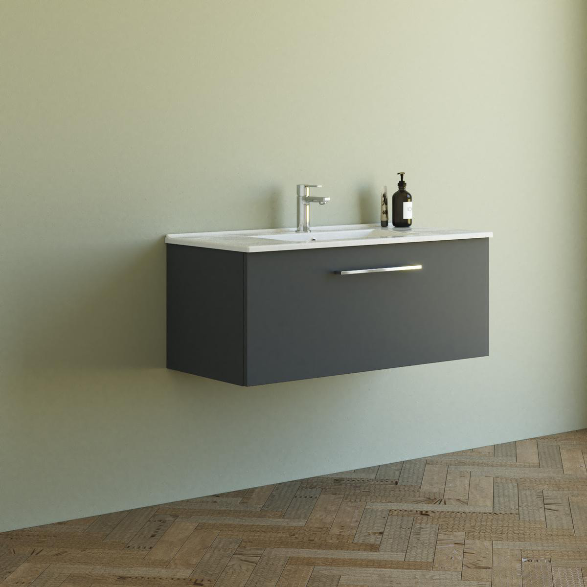 101 cm møbelpakke med vaskeskab og Amber håndvask i grå. Håndvasken er fremstillet af sanitetsporcelæn, der er let at rengøre og vedligeholde. Skuffen har soft-close funktion.