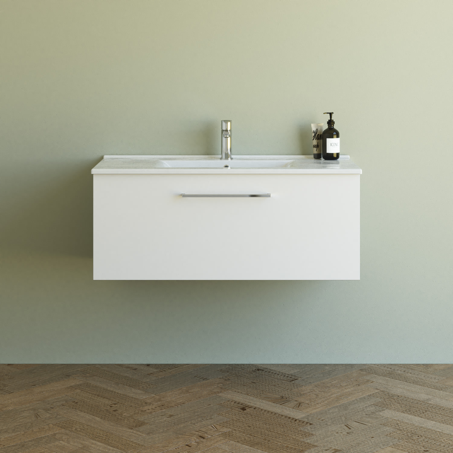 Med Dansani Mido møbelpakken får du et komplet sæt til dit badeværelse. Denne pakke indeholder et stilrent vaskeskab med én skuffe og en elegant Amber håndvask. Møbelpakken er designet til at give dit badeværelse et moderne og funktionelt løft.