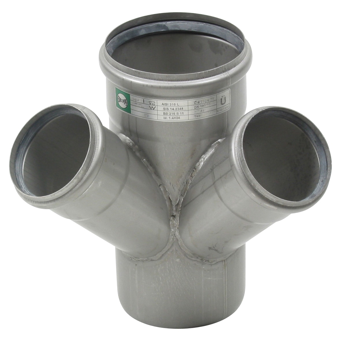 Dobbelt grenrør i syrefast, rustfrit stål. Vinkel på 45° og diametre på ø110/75mm. Højde: 45mm.