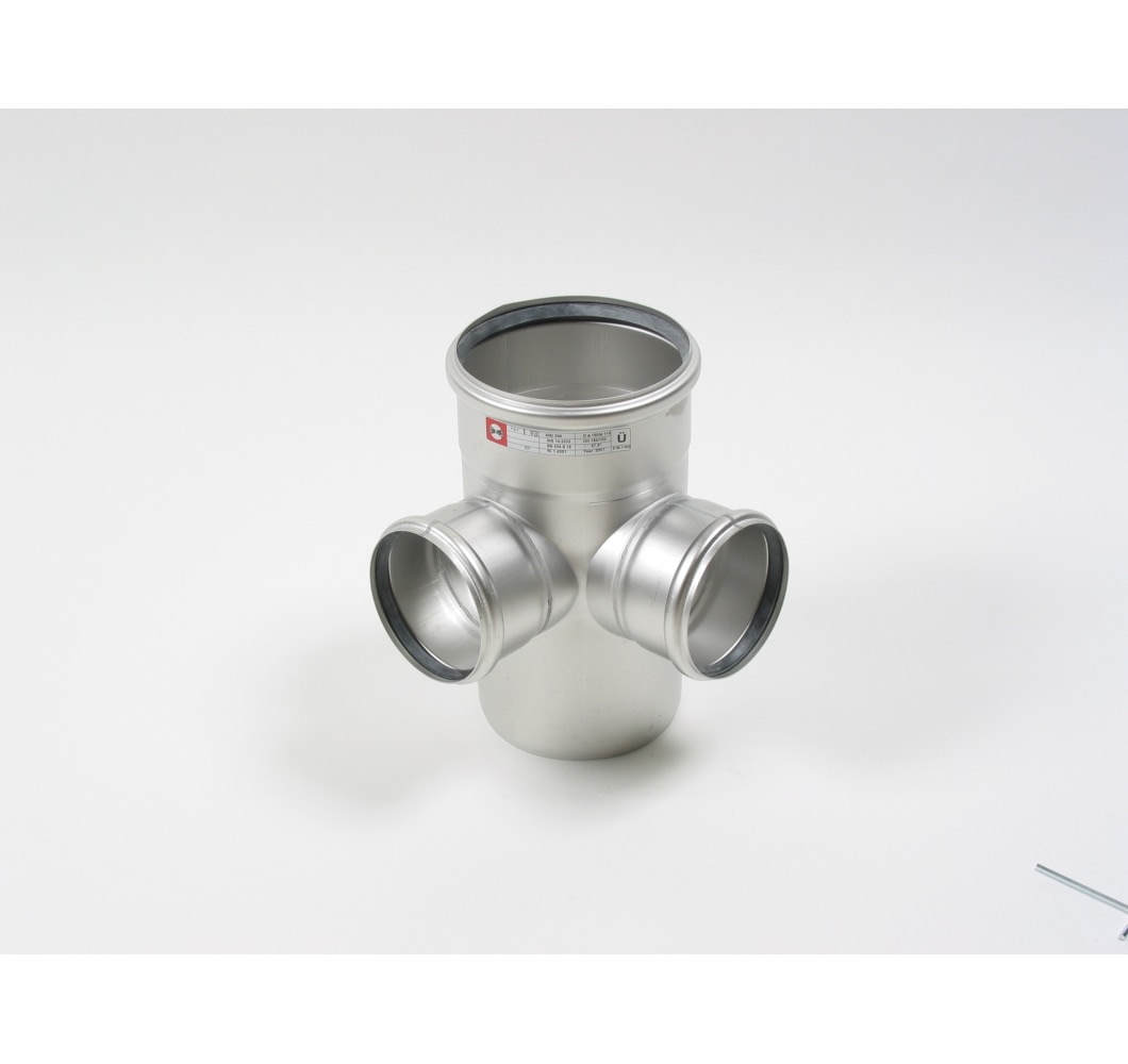 Dobbelt grenrør i rustfrit stål (AISI304) med dimensioner på 110 mm (hovedrør) og 75 mm (grenrør). Vinklen er 87,5°.