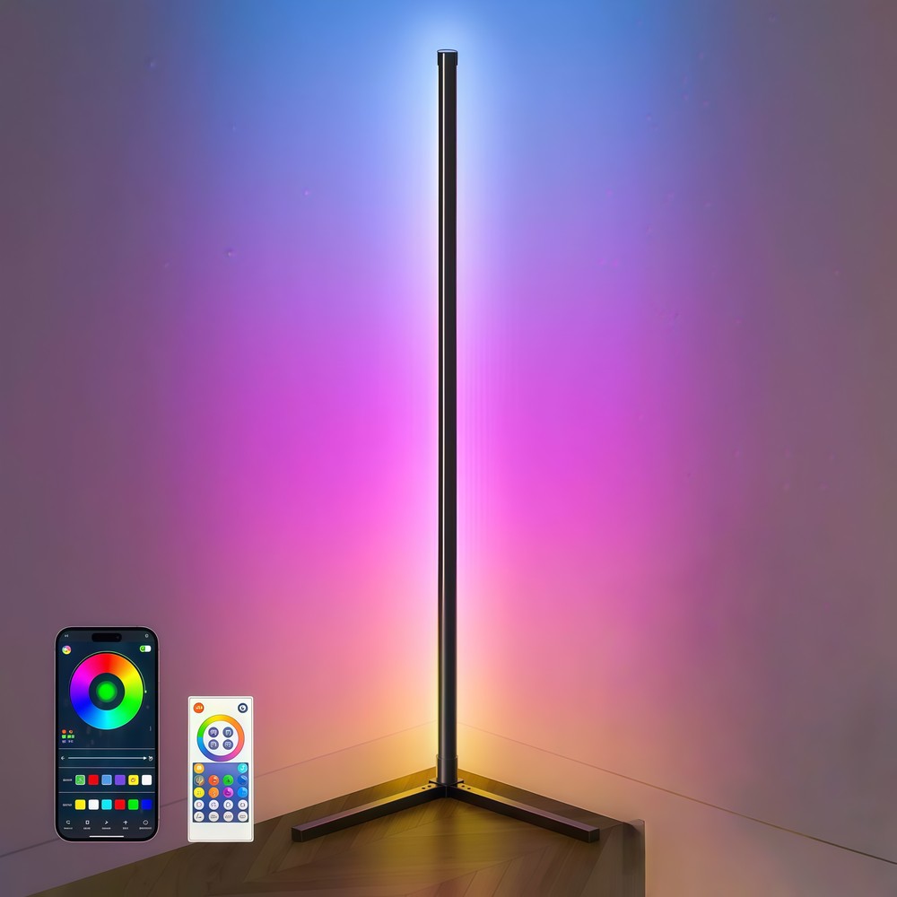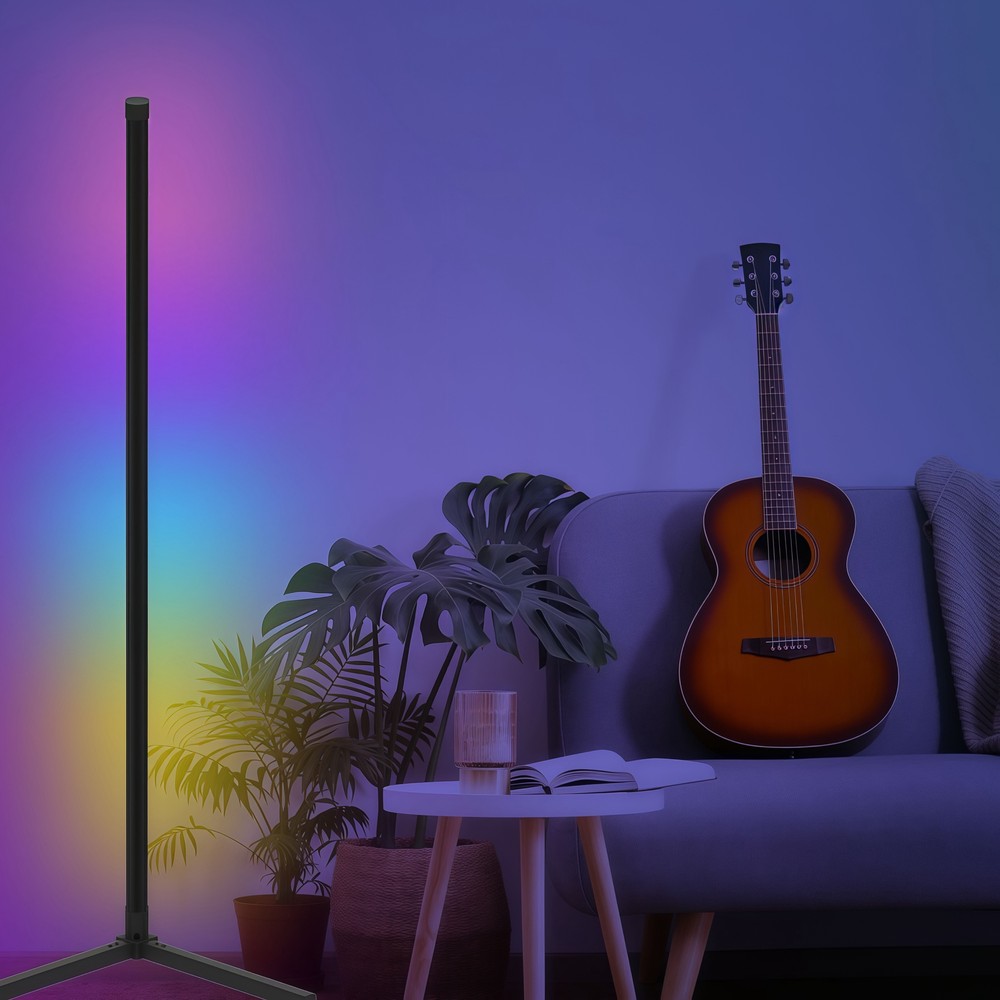 Elegant 120cm sort RGBIC hjørnelampe med Wifi app og fjernbetjening. 12W, 230V, 180° spredning. Energimærke E.