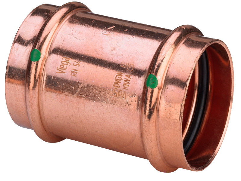 Profipress skydemuffe med prestilslutning til brugsvand, varme- og køleinstallationer. Med SC-Contur, der sikrer synligt utætte samlinger ved manglende presning.