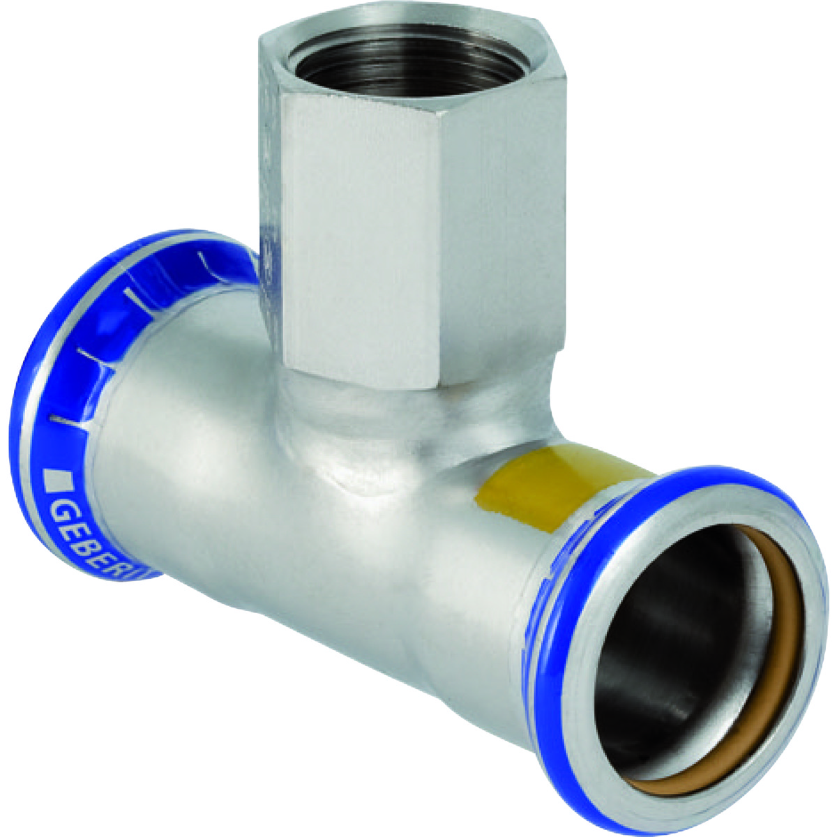 Geberit Mapress rustfrit T-stykke med indvendigt gevind (gas), syrefast: d=15 mm, Rp=1/2, d1=15 mm.