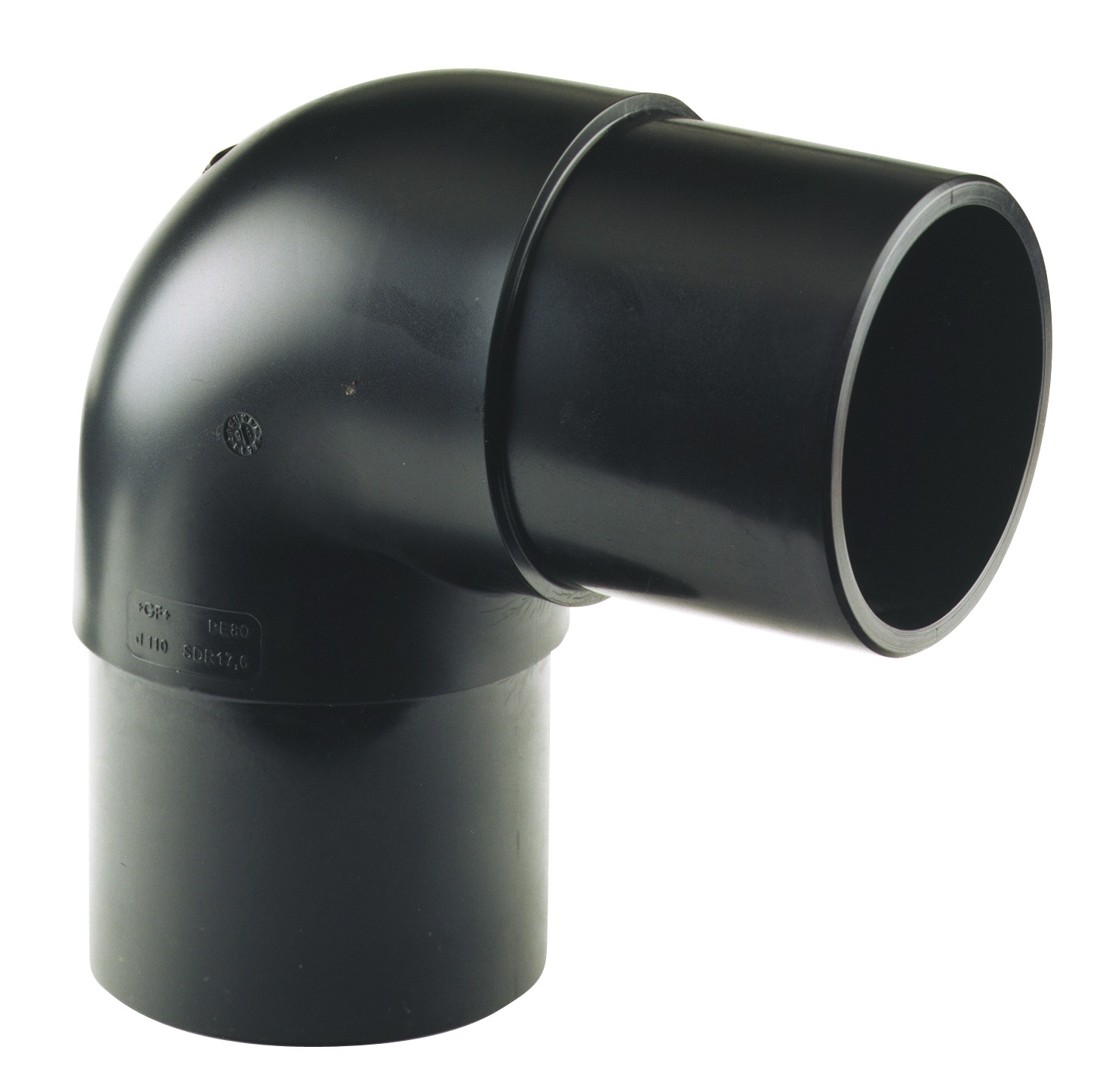 PE-svejsevinkel med spidsende til stuk-/elsvejsning. Anvendes til gas (maks. 10 bar) og vand (maks. 16 bar). Fremstillet i PE100 SDR11.
