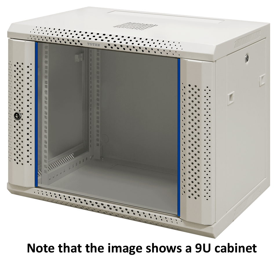 19″ vægskab med 6U, 600 mm bredde og 450 mm dybde. Hvid med glasdør.