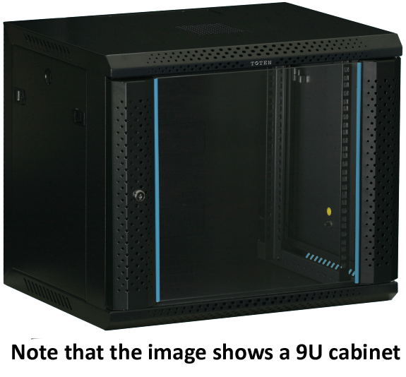 19" vægskab, 15U, 600x450 mm med glasdør i sort udførelse. Ideel til netværksinstallationer.