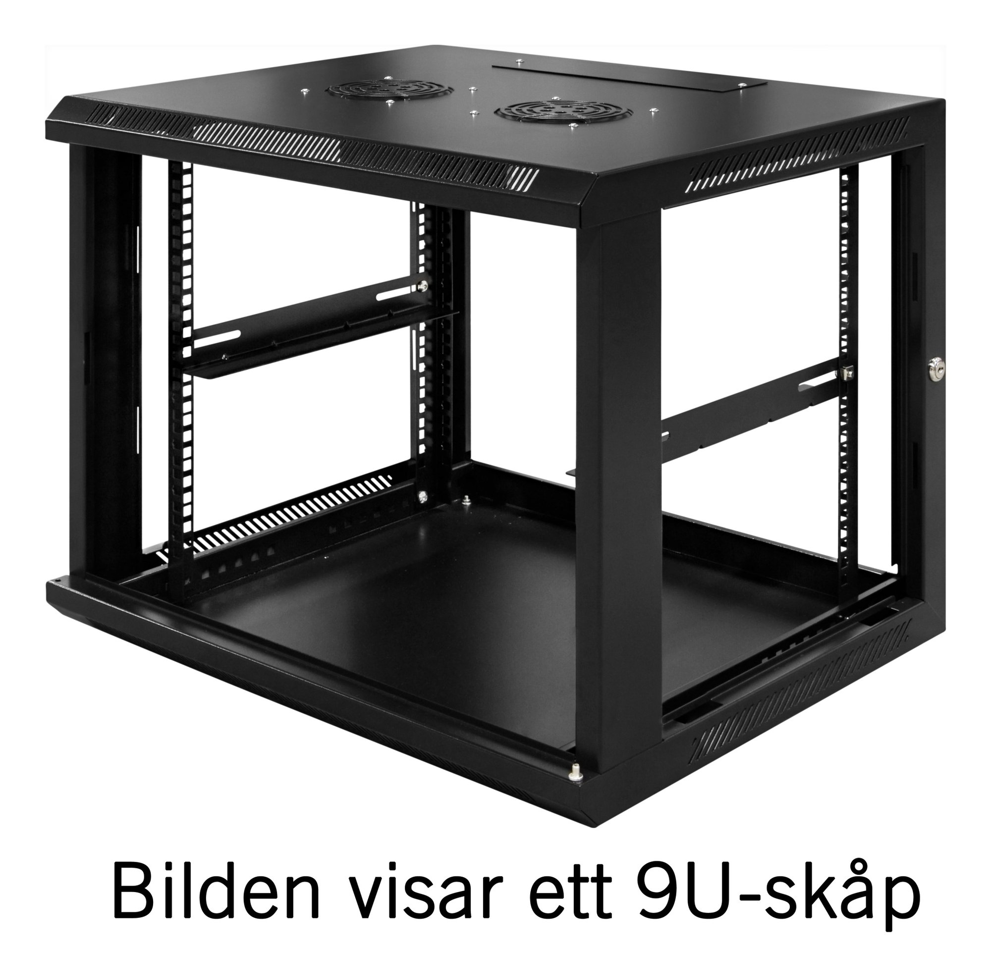 Rummeligt 19" vægmonteret kabinet, der kan svinges ud fra væggen for nem adgang til udstyret bagved. Hængslet tilføjer 20 mm til bredden i venstre side, set forfra.