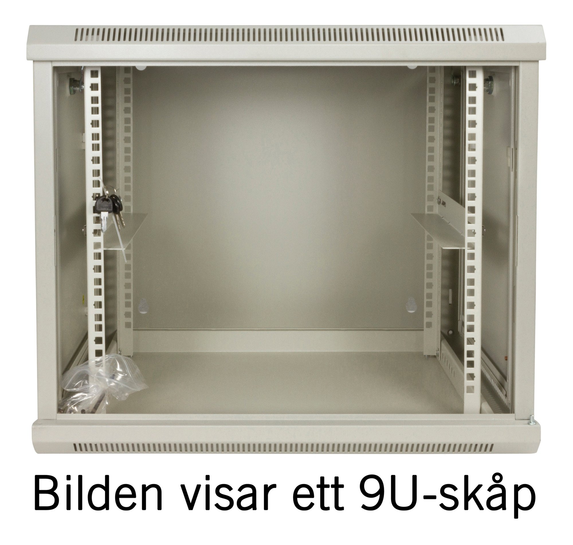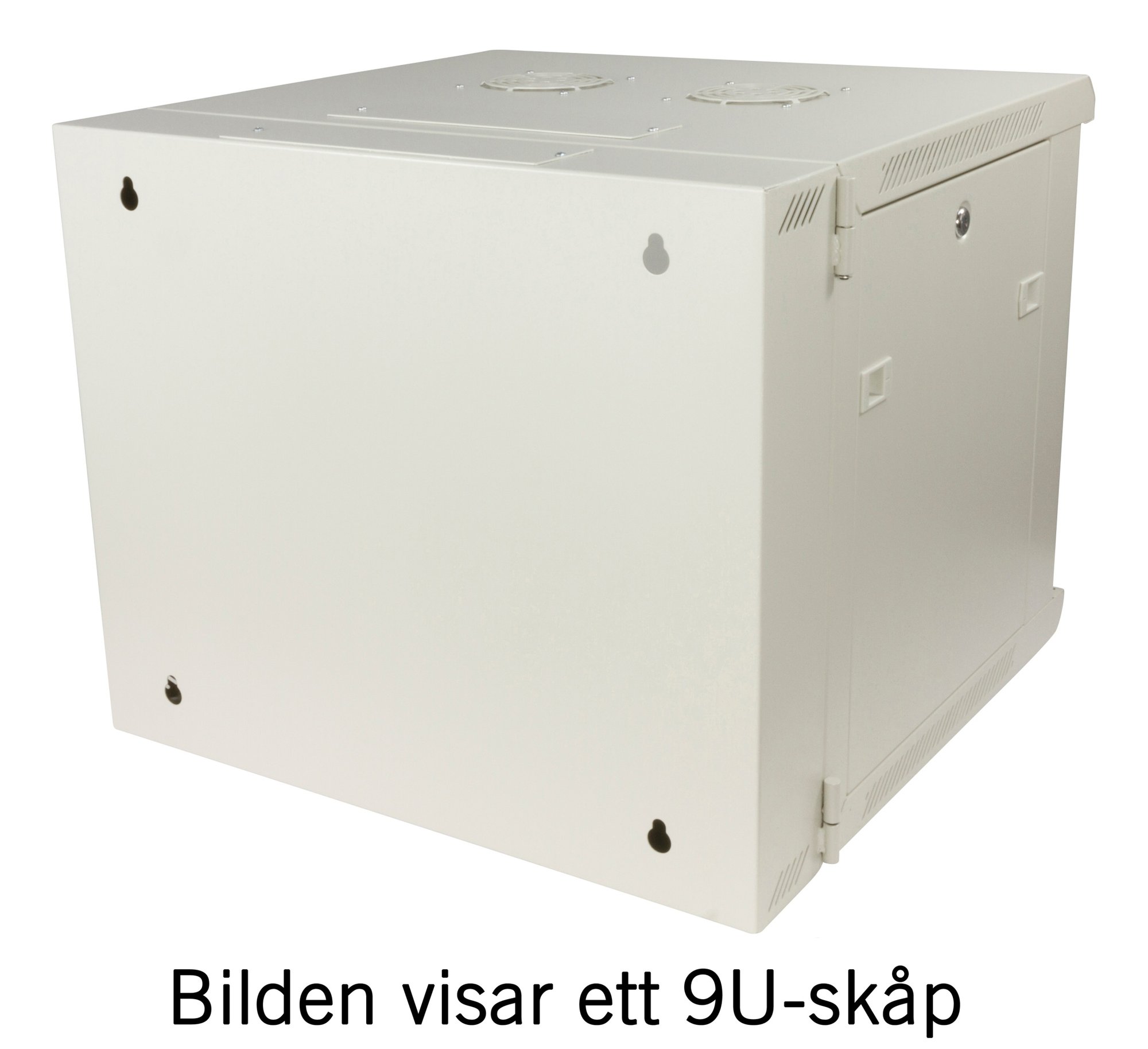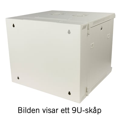 Rummeligt 19” vægskab, der kan svinges ud fra væggen for nem adgang til udstyr bagtil. Hængslet tilføjer 20mm bredde.