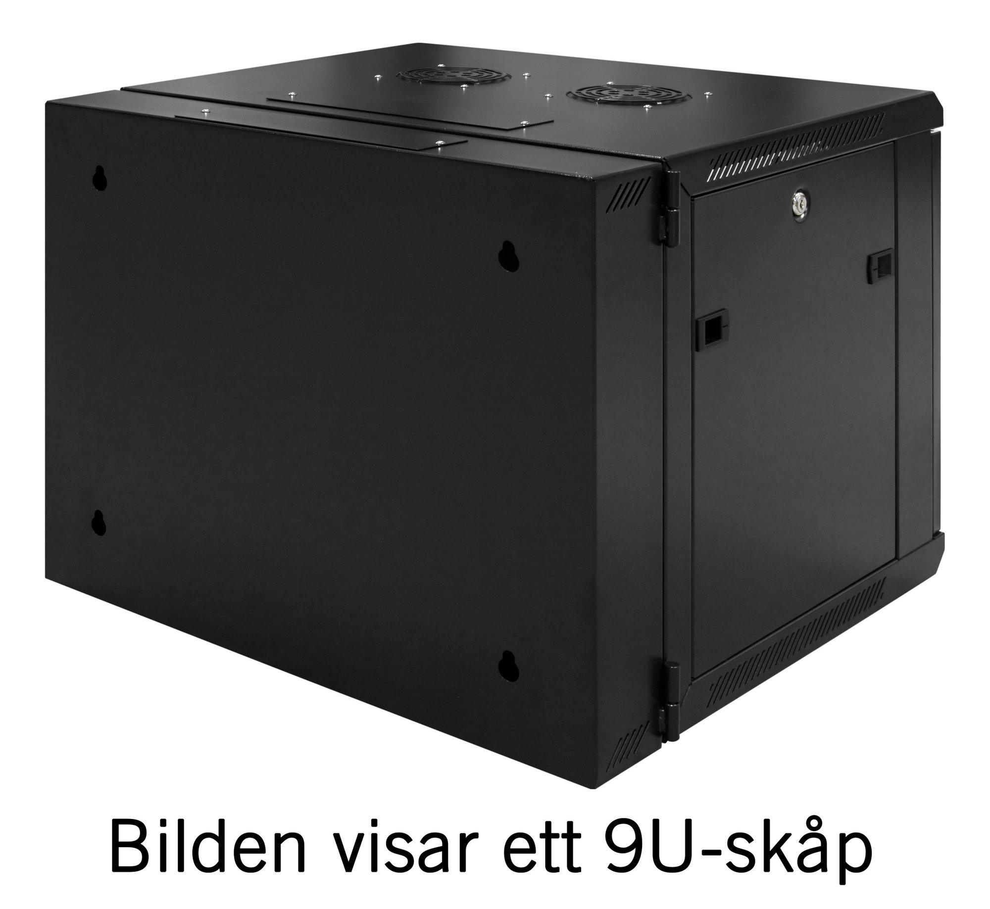 Rummeligt 19" vægskab, der kan svinges ud fra væggen for nem adgang til udstyret bagved. Hængslet tilføjer 20 mm til bredden i venstre side, set forfra.