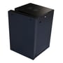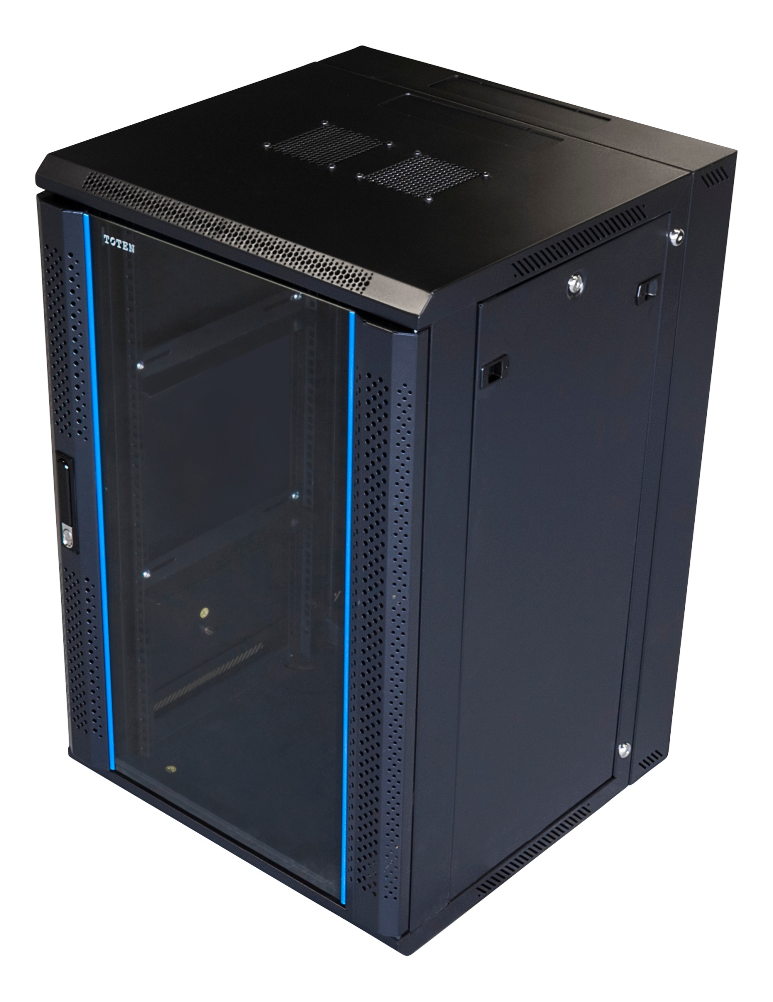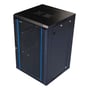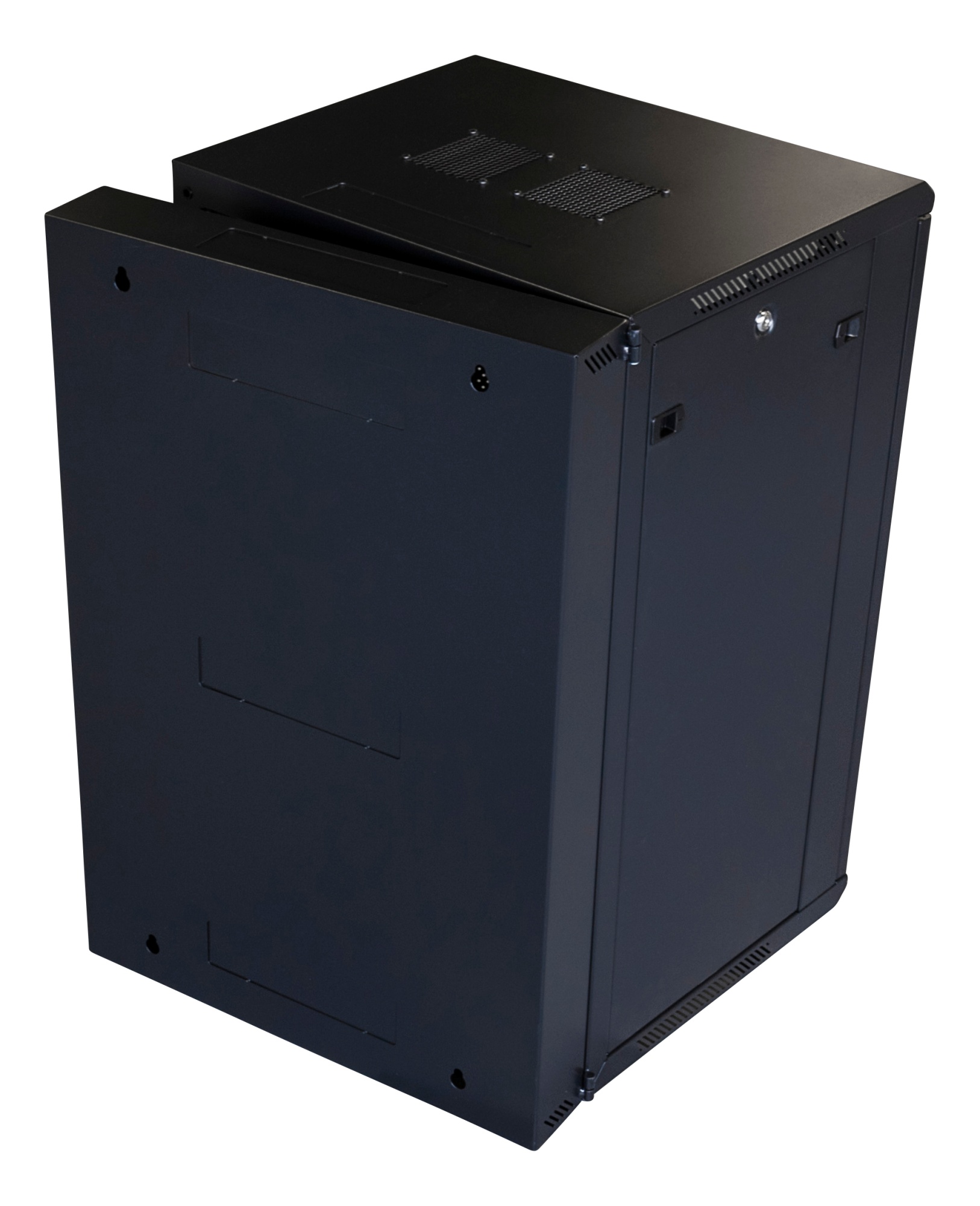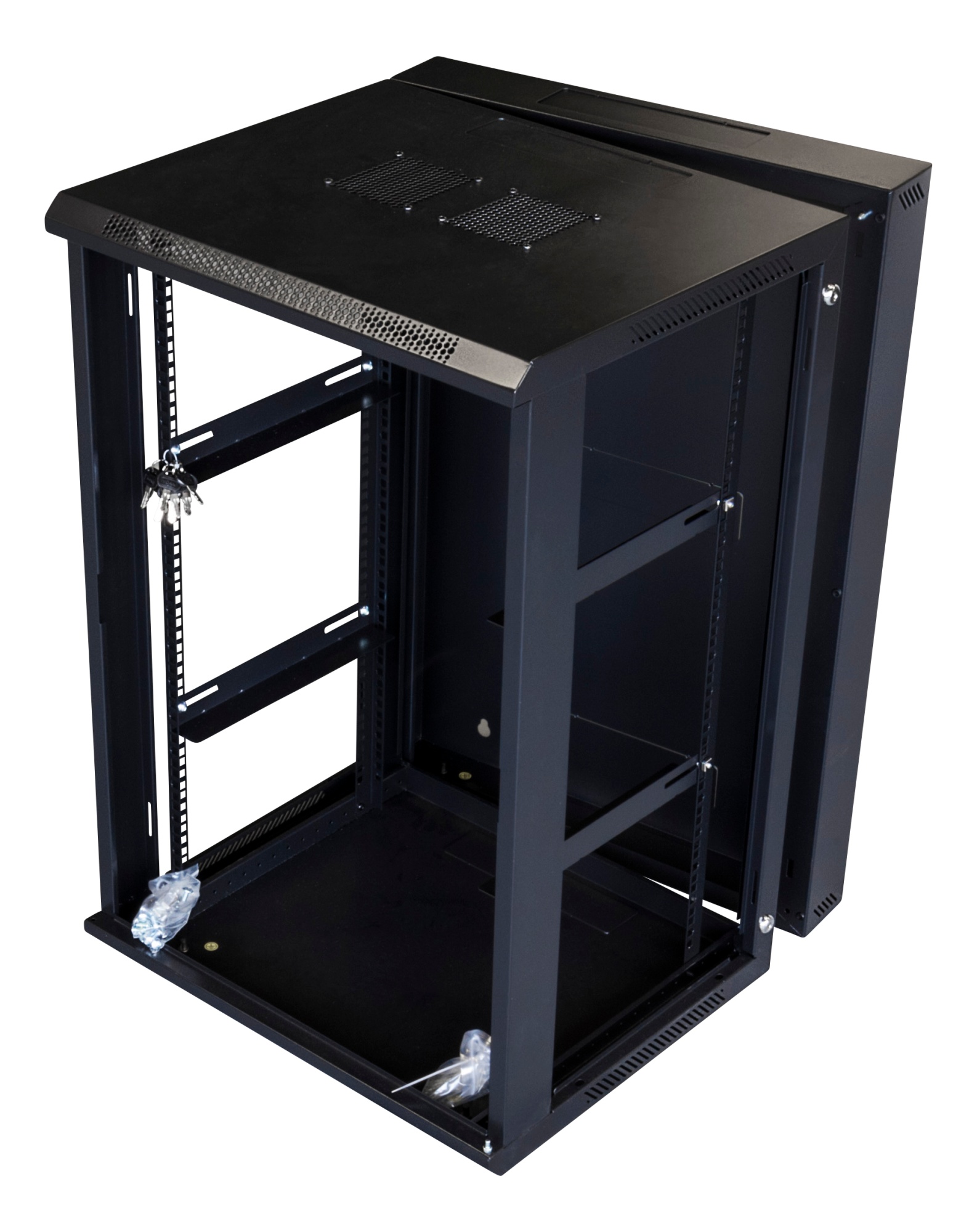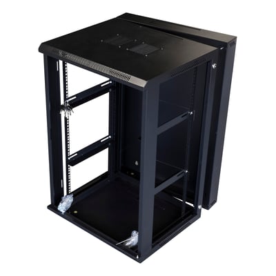 Rummeligt 19" vægmonteret kabinet, der kan svinges ud fra væggen for at tilgå udstyret bagpå. Hængslet tilføjer 20 mm til bredden i venstre side, set forfra.