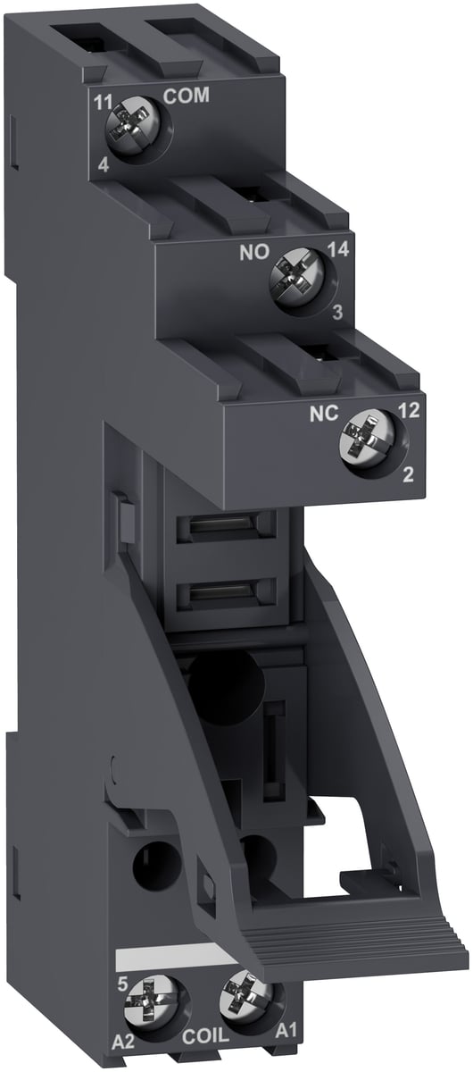 RGZE1S35M er en relæsokkel med skrueterminaler for RXG serien. Soklen har en bredde på 16 mm, og der kan isættes beskyttelsesmoduler direkte ved forsyningsterminalerne. Den integrerede holdebøjle sikrer, at relæet ikke falder ud, når det først er isat.