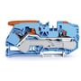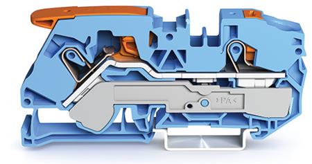 2-leder-gennemgangsklemme med pal og betjeningsknap, 16 mm2, med testport og side- og midteropmærkning. Til DIN-skinne 35 x 15 og 35 x 7,5.