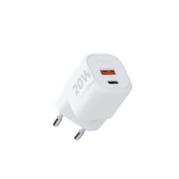 Hurtig og effektiv opladning med 20W GaN2 Ultra hjemmeoplader. USB-C PD og USB-A porte. Kompakt design i hvid.