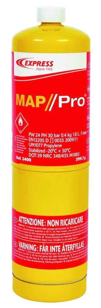 Express gasdåse MAP/PRO, der leverer effektiv varme op til 2400°C. Kompatibel med Express Vulcane brænder og andre med 1"-20 gevind pr. tomme (60°) US standard.