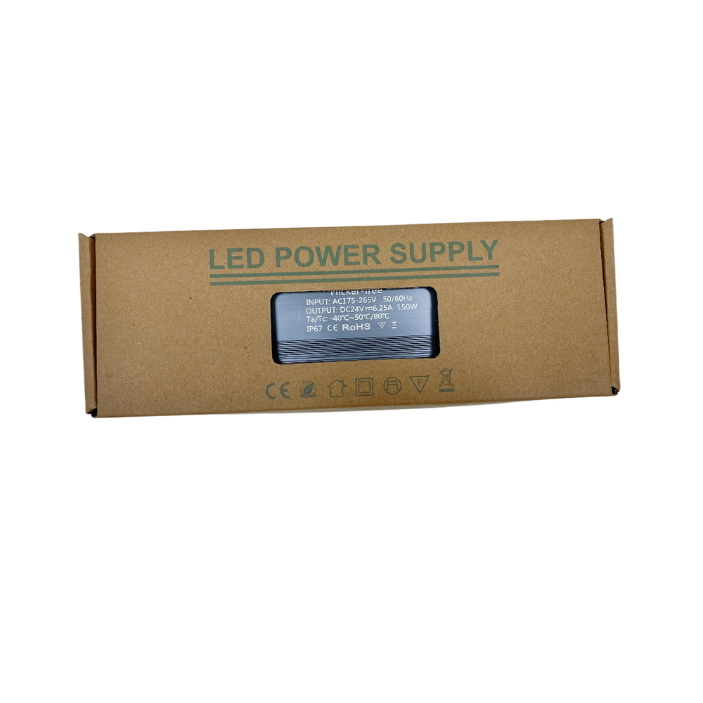 24V DC strømforsyning med 150W effekt og IP67-klassificering. Flicker free for stabil drift.