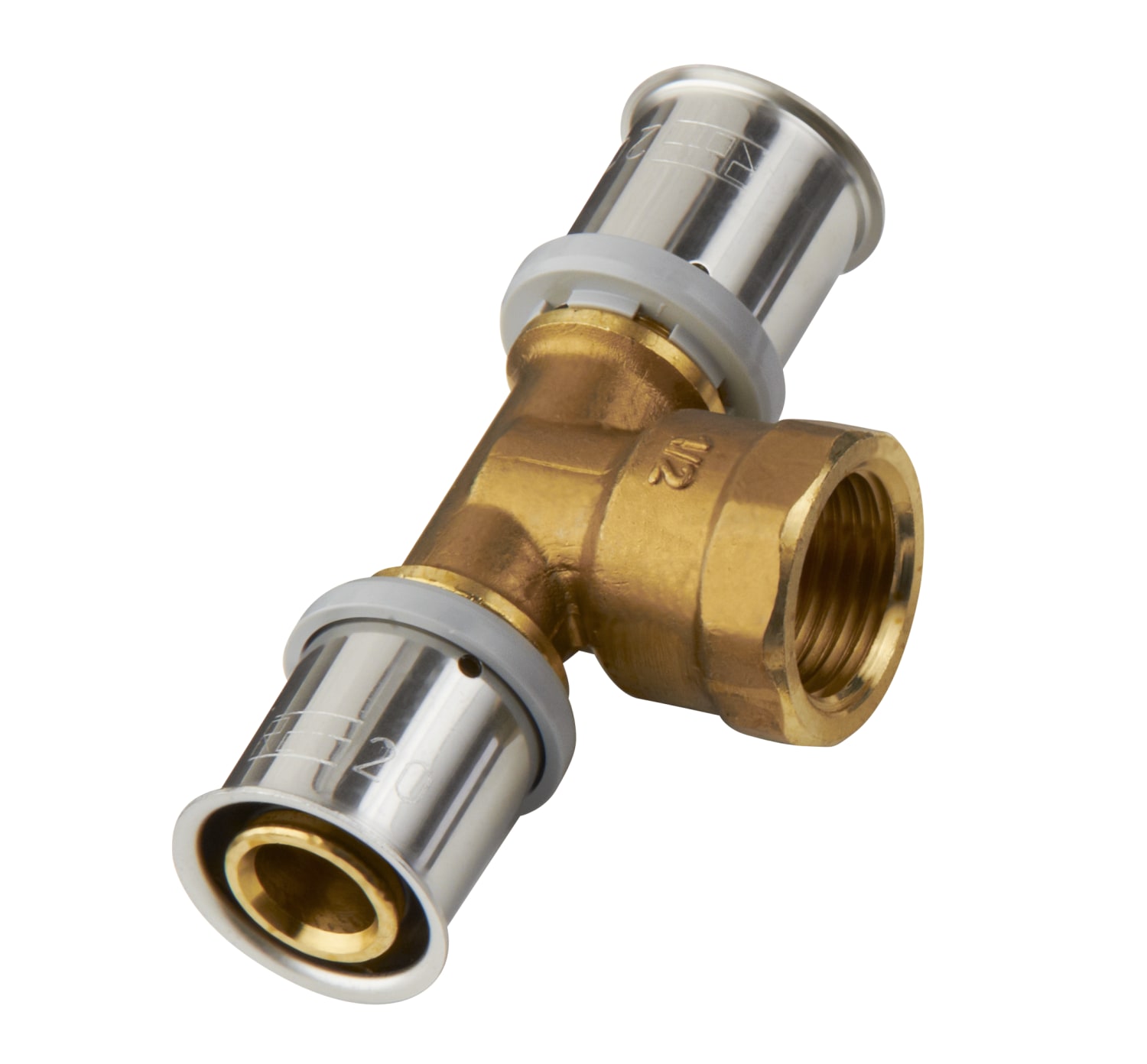PressCheck T-stykke i korrosionsbestandig messing med indvendigt gevind på afgreningen. Anvendes bl.a. i forbindelse med gevindfittings, ventiler og lignende.