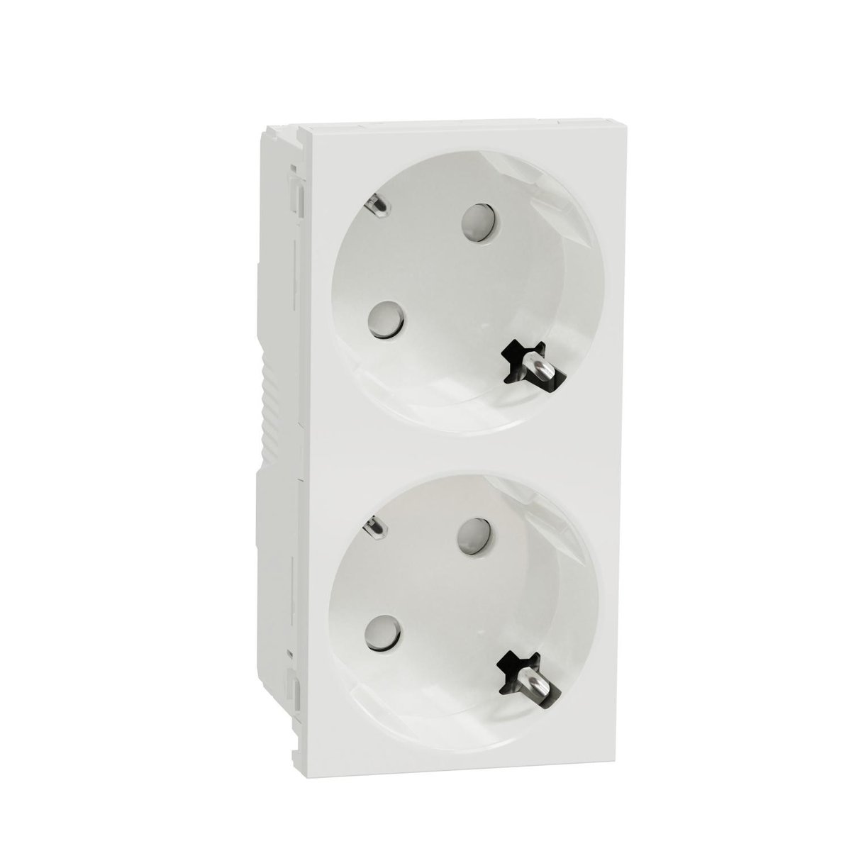 Schneider Electric Unica NU306618 er en dobbelt stikkontaktindsats i hvid (RAL9003). Denne stikkontakt overholder tysk standard og har en mærkestrøm på 16A. Den er designet til nem og hurtig installation i Unica dåser eller underlag samt OptiLine installationssystemet, uden brug af værktøj.