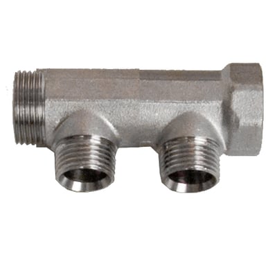 2-grens fordelerrør fra Pettinaroli i messing med korrosionsbeskyttende TEA-belægning. Velegnet til drikkevandssystemer.