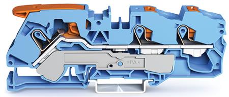 3-leder-gennemgangsklemme med pal og betjeningsknap, 16 mm2, med testport og side- og midteropmærkning. Til DIN-skinne 35 x 15 og 35 x 7,5.