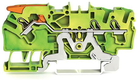 3-leder-jordklemme, 2,5 mm², med testport og side- og midteropmærkning. Til DIN-skinne 35 x 15 og 35 x 7,5. Grøn/gul.