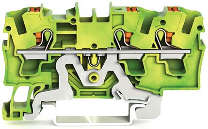 3-leder-jordklemme, 4 mm², med testport og side- og midteropmærkning. Til DIN-skinne 35 x 15 og 35 x 7,5. Push-in CAGE CLAMP, grøn-gul.