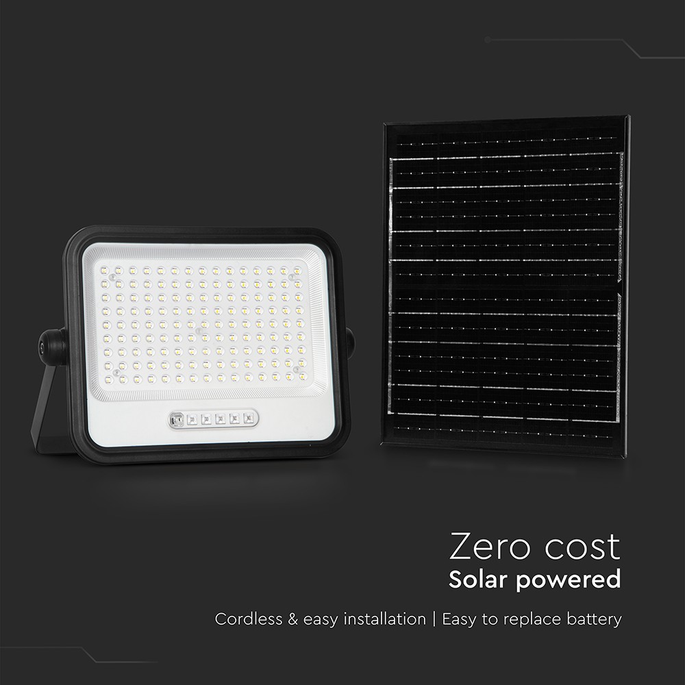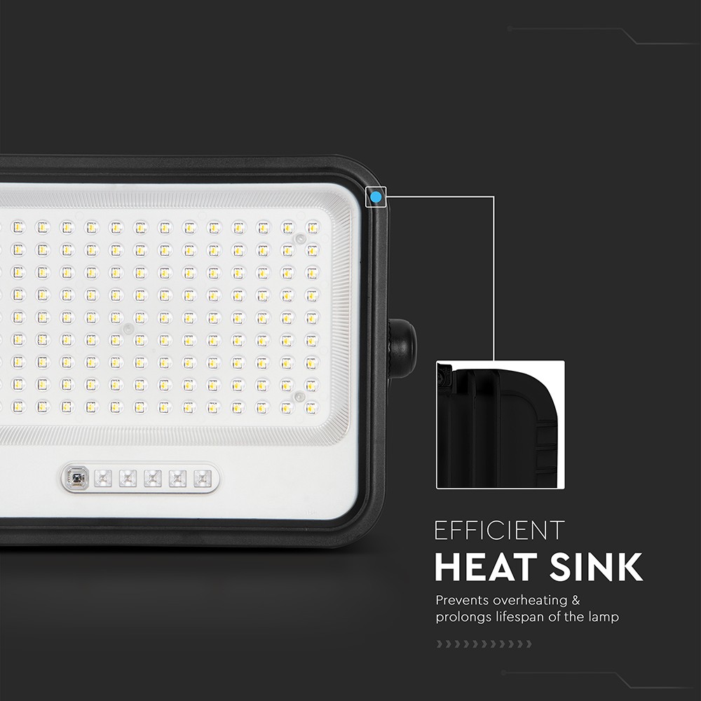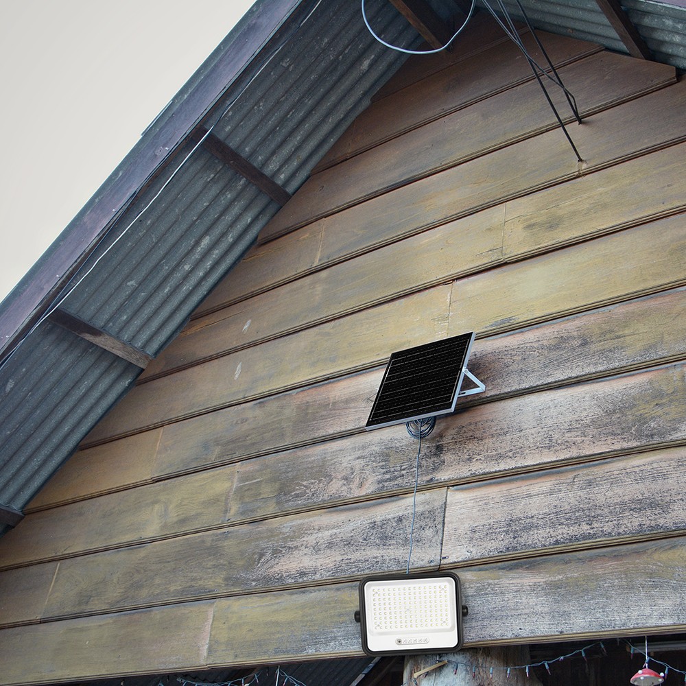 Kraftig 300W LED projektør med solpanel. IP65-klassificeret, 2400lm lysstyrke og CCT:7in1 farvetemperaturvalg. Ideel til udendørs brug.