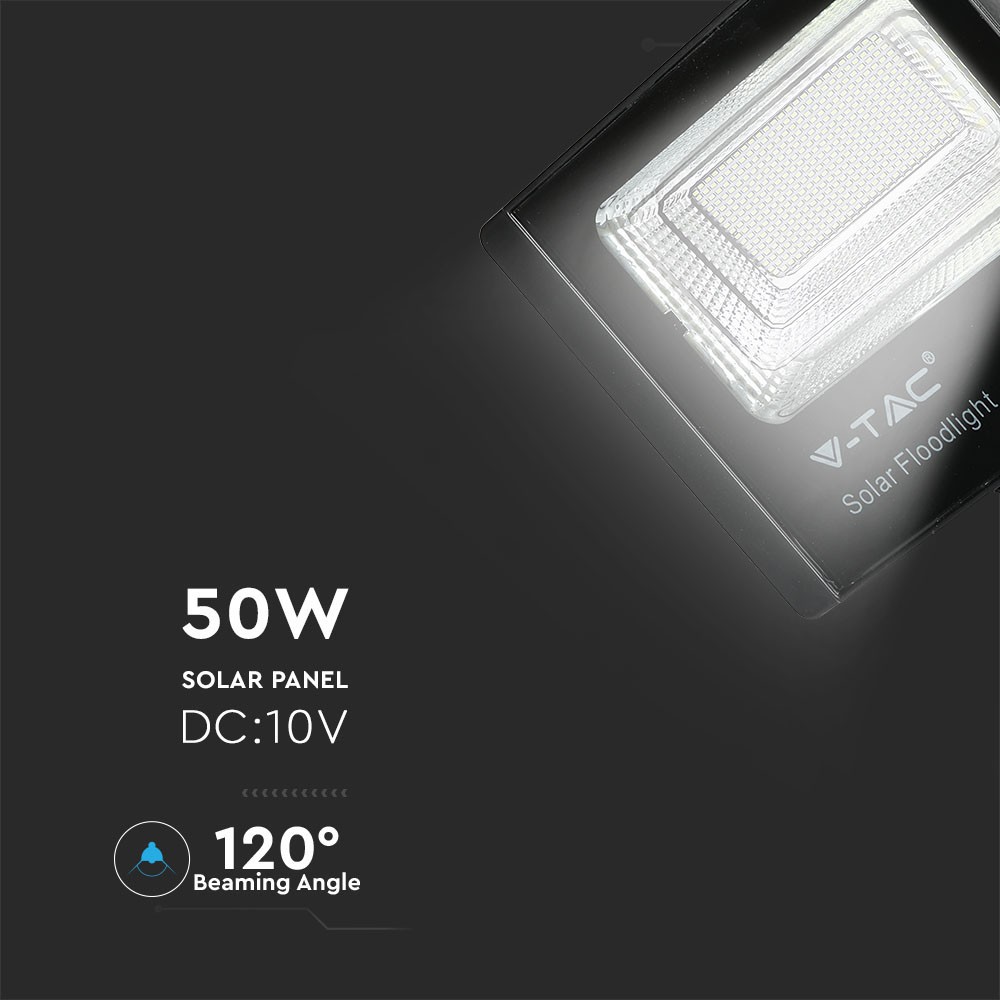 300W VT solpanel med 50W LED projektør, der leverer 4200lm ved 6000K. IP65-klassificeret og ideel til udendørs brug.