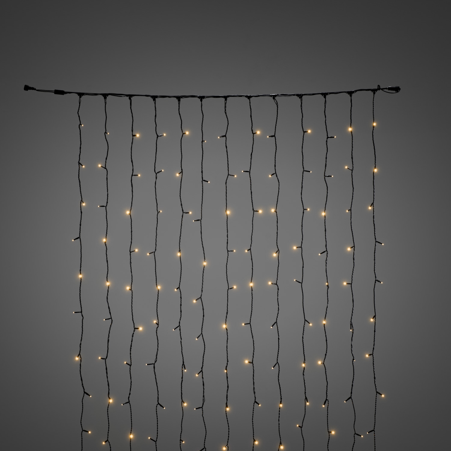 Konstsmide gardinlyskæde med 208 ravfarvede LED-lys, 31V, og dæmpbar funktion. Ideel til udendørs brug med IP44-klassificering og en bredde på 1 meter.