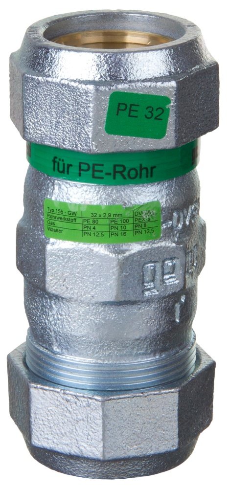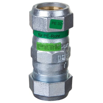 GEBO blødstøbt fittings anvendes på PE-rør til transport af vand, gas eller trykluft. Denne kobling er af typen O og har dimensionerne 32 mm x 1".