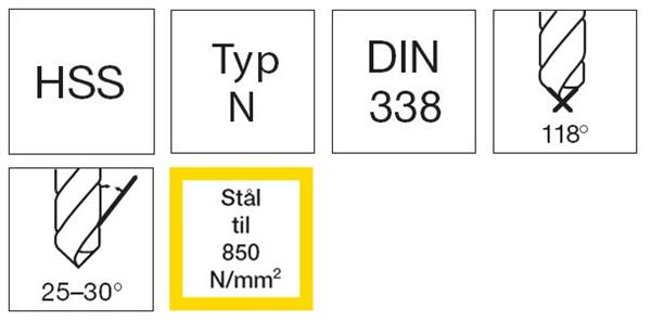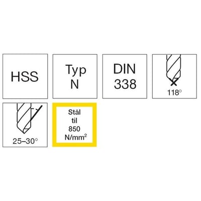 Spiralbor type N HSS-R valset, med neddrejet skaft og dampbehandling. Optimal til stål.