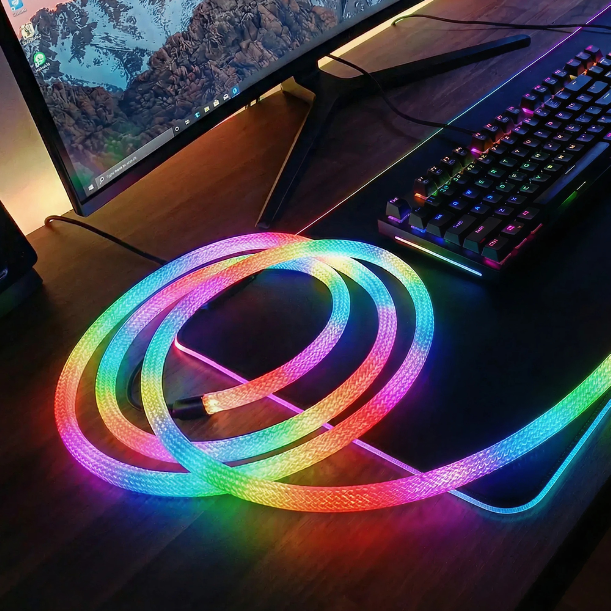Slangen er udstyret med RGBIC teknologi, der giver mulighed for individuelle farveeffekter langs slangen, hvilket skaber en unik og levende atmosfære. Det vævede reb-design bidrager til en ensartet lysfordeling og en flot finish.