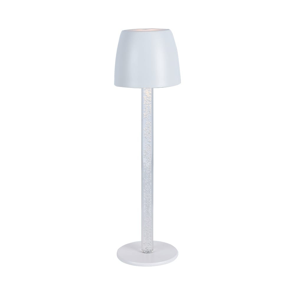 Elegant 3W LED bordlampe med touch dæmpning, transparent stang og et stilrent hvidt design. Perfekt til skrivebordet eller natbordet.