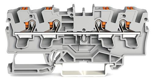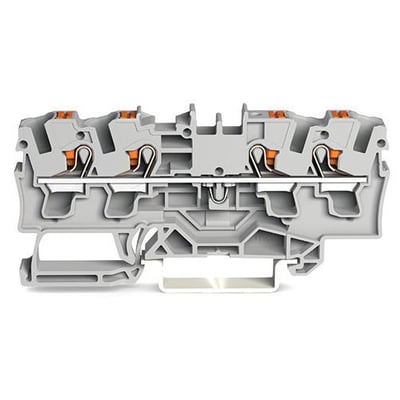 4-leder-gennemgangsklemme med betjeningsknap, 4 mm². Med testport og side- og midteropmærkning. Til DIN-skinne 35 x 15 og 35 x 7,5.