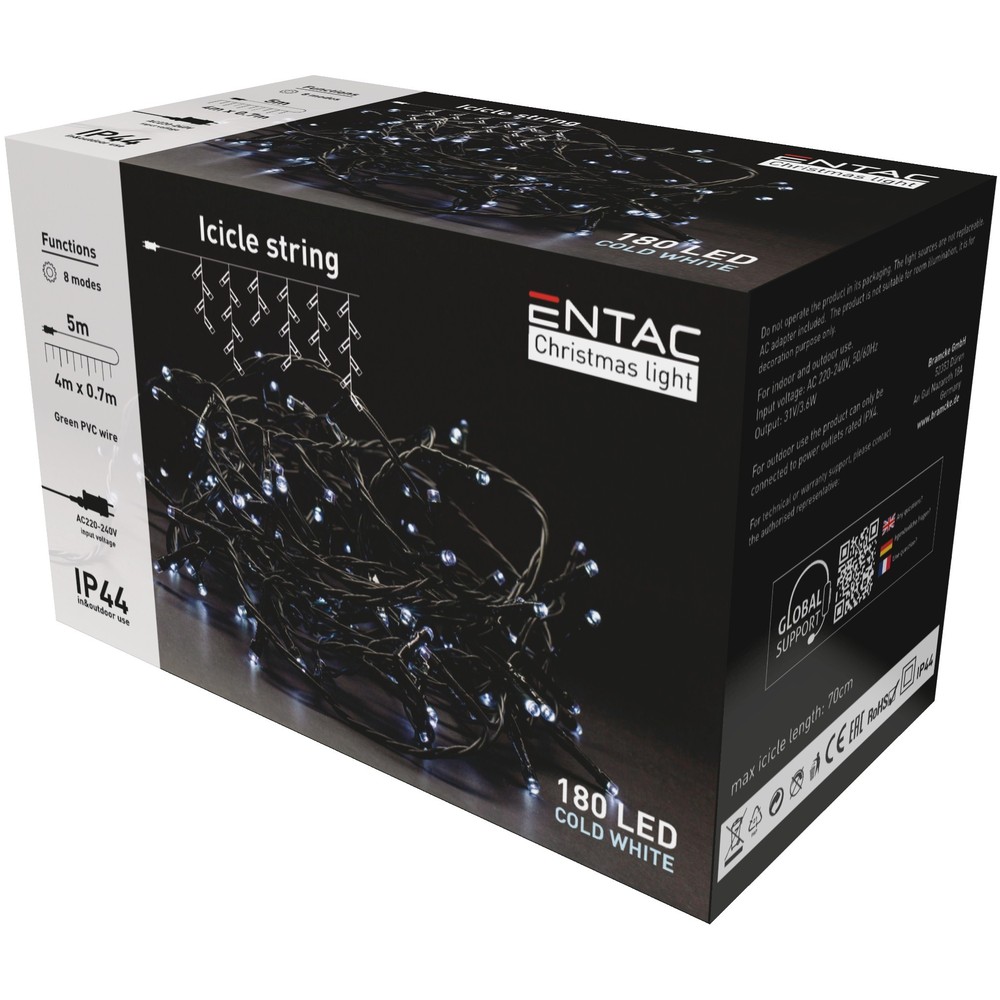 Denne iskrystal LED lyskæde er designet til at skabe en hyggelig og festlig stemning i dit udendørs miljø. Med en længde på 4 meter og hele 180 kold hvide LED'er giver den et klart og strålende lys, der er perfekt til at dekorere facader, træer eller buske.