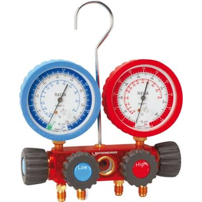 Rothenberger analog 4-vejs manometer med skueglas til varmepumper. Bruges til kølemidlerne R410A og R32.