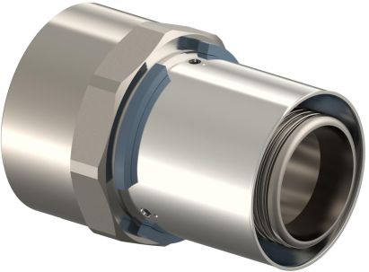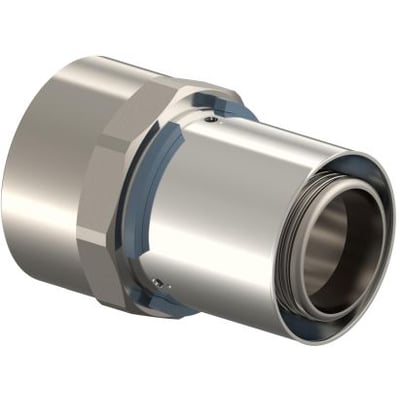 Uponor S-Press kobling i forkromet messing til brugsvands- og radiatorsystemer. Med gevindmuffe, preskappe af rustfri stål/aluminium, pres-identifikation og stopring.
