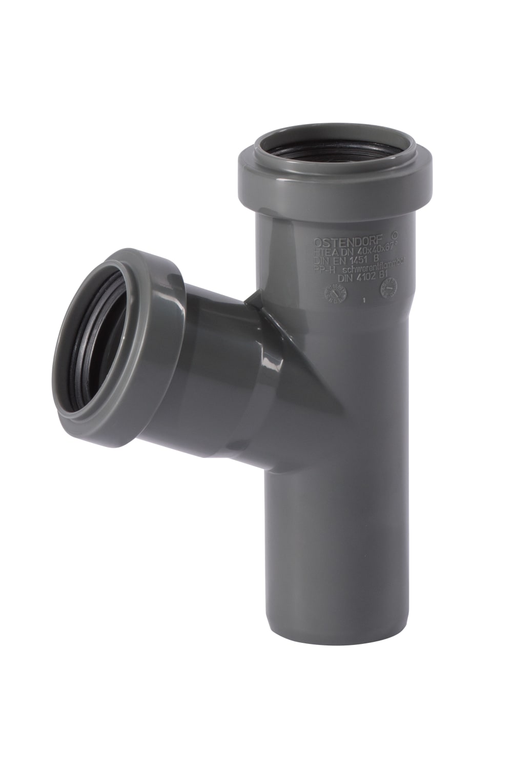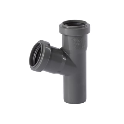 Gråt 40 mm grenrør til afløb i PP med en vinkel på 67°.