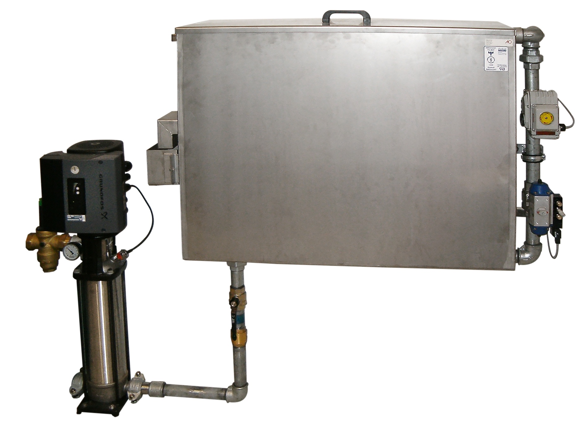 Tanken har justerbare ben som standard, men kan vægmonteres med en centerafstand mellem monteringspunkterne på 1200 mm. Af hensyn til luftgab er det vigtigt, at den fastmonteres. Tilsluttes via 1.1/4"-rørgevind, som reguleres med en svømmeventil, eller som tilvalg, en langsomt lukkende magnetventil. Udløbet sker gennem et aflangt, ikke-cirkulært afløb. Ekspansionsbeholder/membrantank kan monteres et valgfrit sted på udgående ledning. Pumpen er fritstående og har frekvensomformer, hvilket gør den velegnet til applikationer med konstant flow eller med to eller flere spuleslanger.