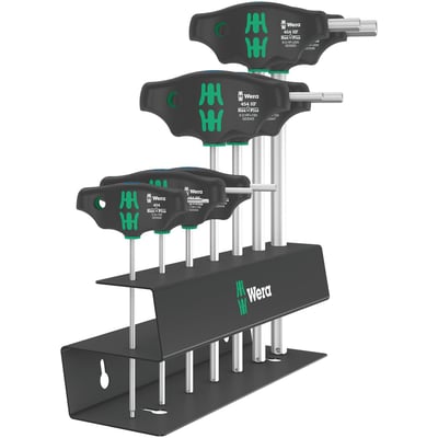Tværgrebs-skruetrækkersæt fra Wera med 7 dele. Ideel til overførsel af store spændings- og løsningsmomenter. Med holdefunktion og metalrack til opbevaring.