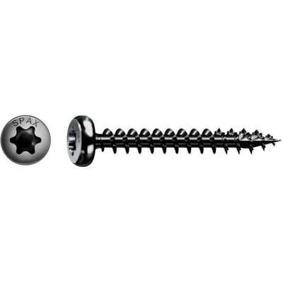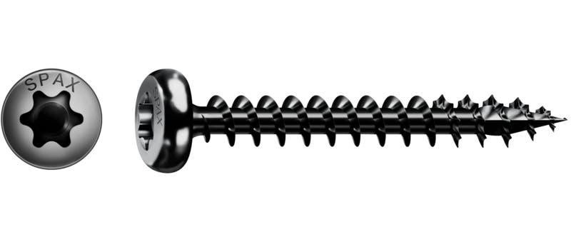 Spånpladeskrue med panhoved, T20 T-STAR plus, helgevind. Længde 18 mm. Sort stål.