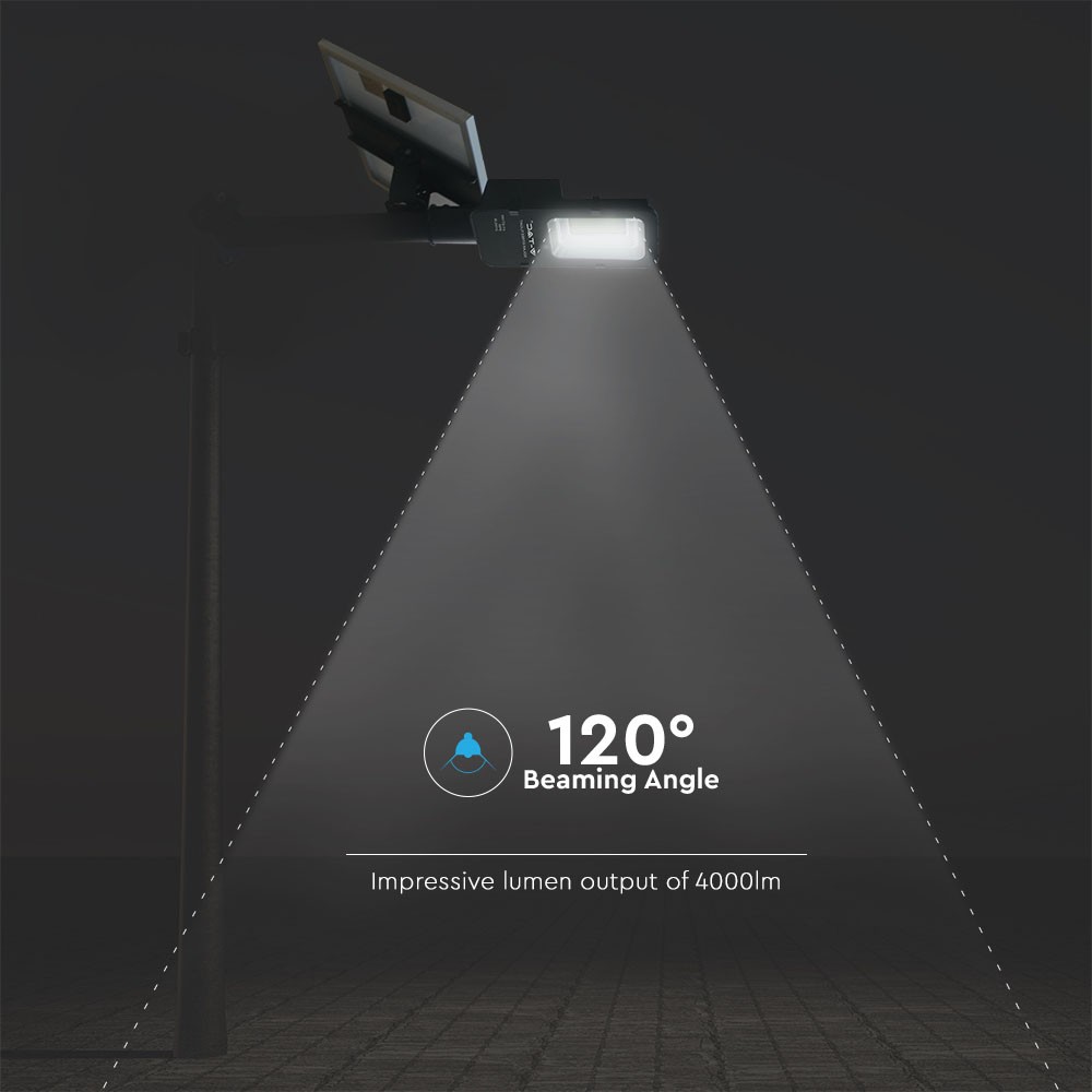 Effektiv 50W LED gadelampe med solcelle. Leverer 4000lm ved 4000K, IP65 klassificeret. Inkl. fjernbetjening og batteri.