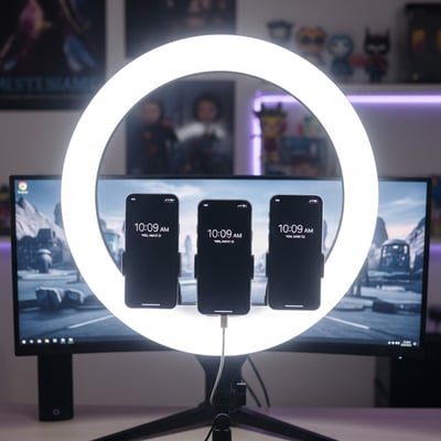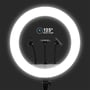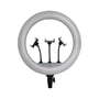 Kraftfuldt 18" LED ringlys på 55W med justerbar farvetemperatur (3200K-5800K) og 6000lm lysstyrke. Inkluderer 3 telefonholdere og fjernbetjening for optimal fleksibilitet.