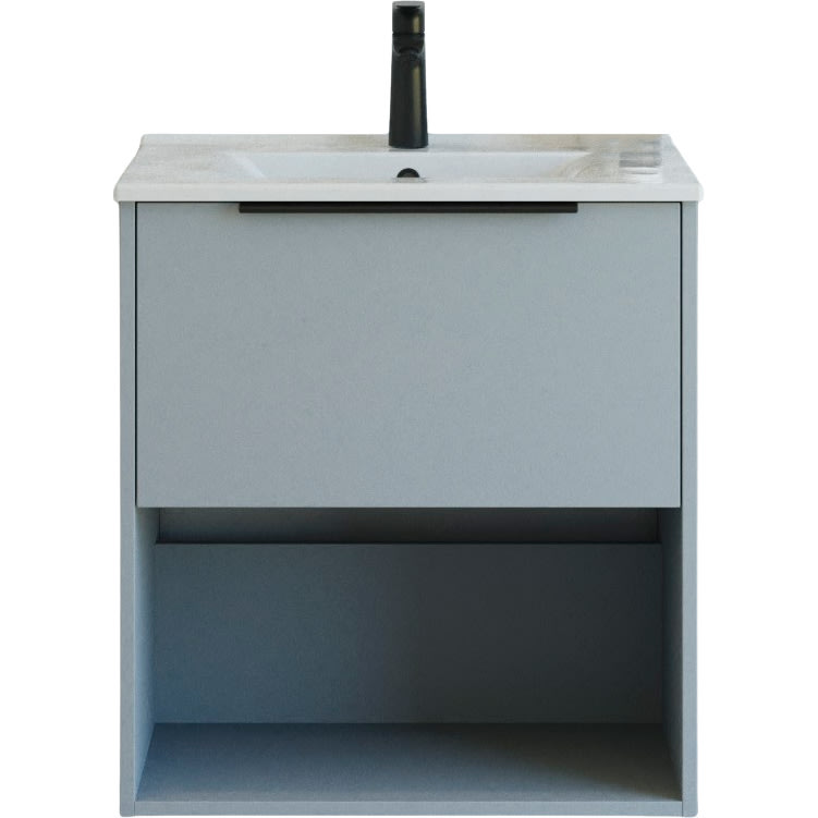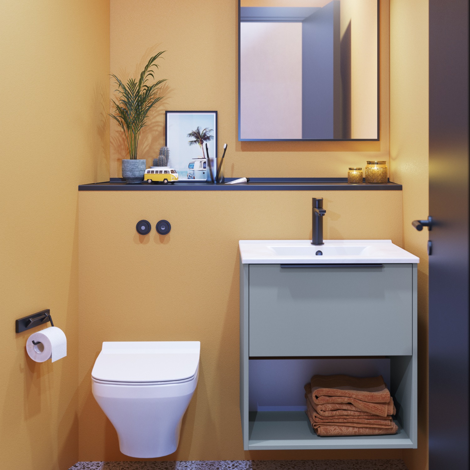 Smart møbelpakke med 60 cm bredt vaskeskab, glat front og åbent rum. Skjult og tilgængelig opbevaring. Amber vask i porcelæn medfølger. Fås i flere farver.